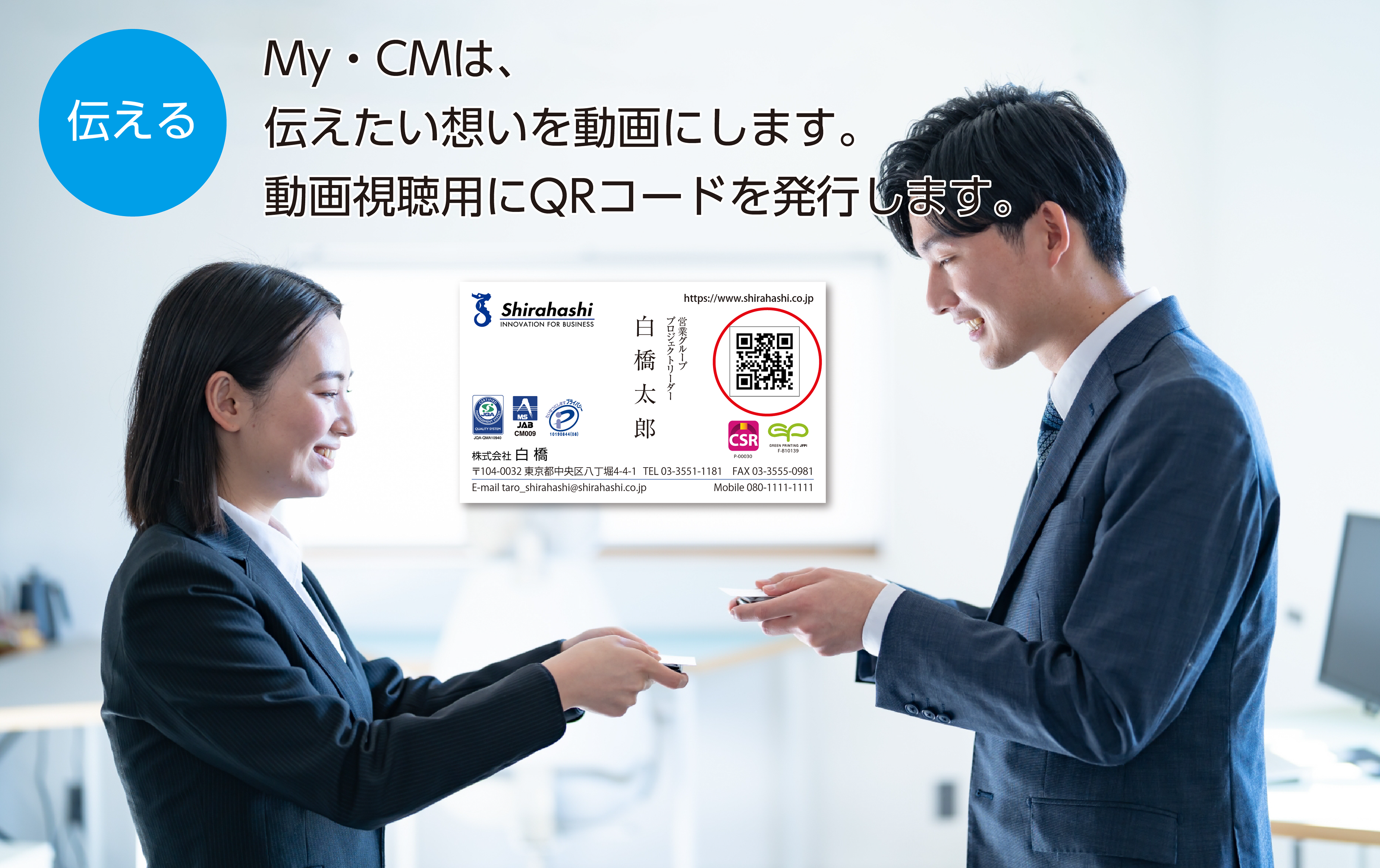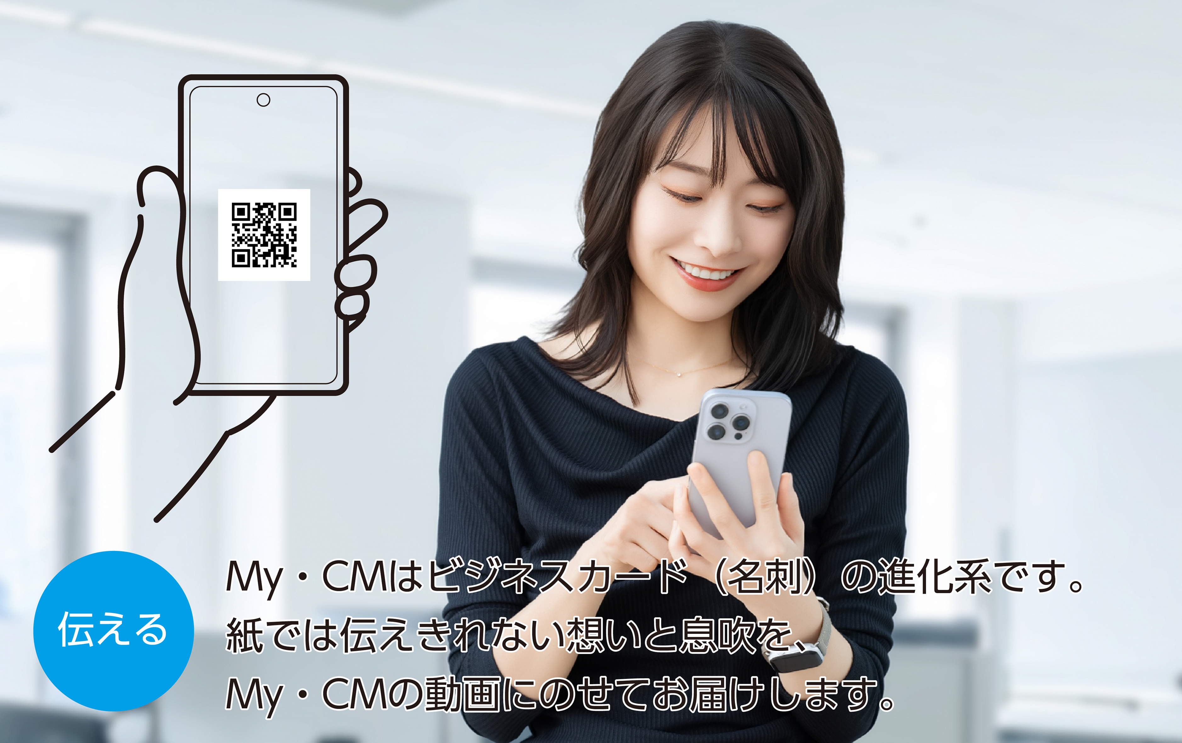My・CMはビジネスカード(名刺)の進化系です。紙では伝えきれない想いと息吹を、My・CMの動画にのせてお届けします。